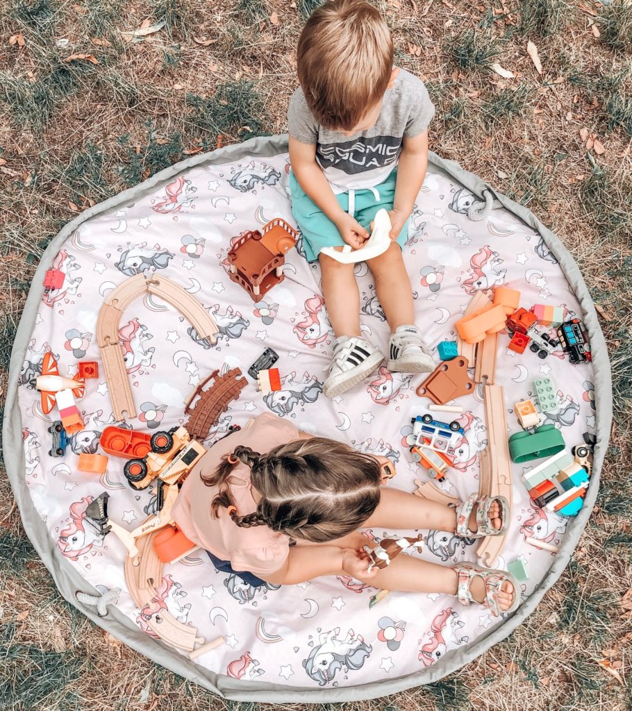 Torba je napravljena tako da može skroz da se raširi i bude kao okrugla prostirka 130cm prečnika. Na njoj klinci mogu da sede i igraju se. Kada se u dva poteza skupi pretvara se u torbu za skladištenje igračaka. Dovoljno je da sve igračke za par sekundi bacite na prostirku, zatvorite je i oslobodite se haosa u stanu.